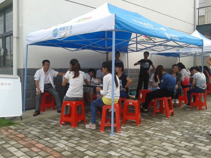 连续两天来的军训,天气都非常炎热,对全体参训的学生来说是个严峻的考验。校医务室克服了人手不足,医疗条件有限、场地等诸多困难,坚持把医务室搬到军训现场,在军训现场边搭建了医疗点帐篷,全程坚守,随时接受前来问医就诊。两天来,医务室已经累计接受了40余名学生前来治疗,他们或因中暑、皮肤灼伤,或因身体不适或其他原因,都得到了有效的治疗。