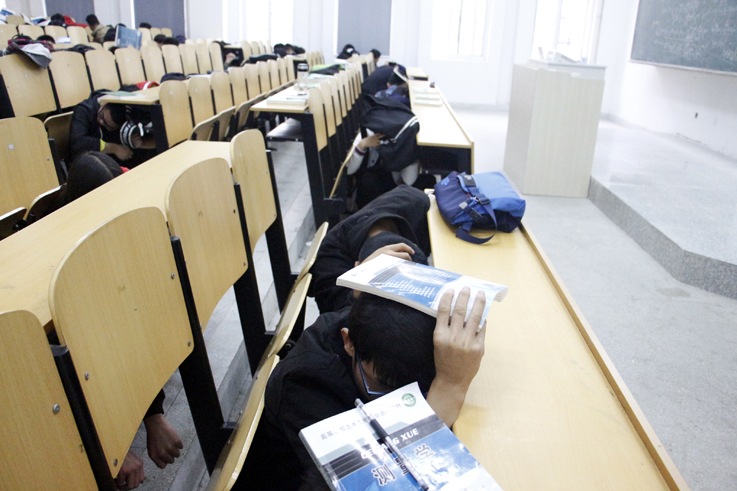 “地震了,同学们紧急避震。”伴随着一阵急促的哨声,教学楼内的学生们迅速下蹲,用手或书本护住头部。一分钟后,第二次紧急哨声响起,“地震了,同学们紧急撤离。”在辅导员、班主任的指引下,同学们迅速撤离教室,按照指定路线,分别从教学楼的南门和北门疏散到楼外安全地点。
