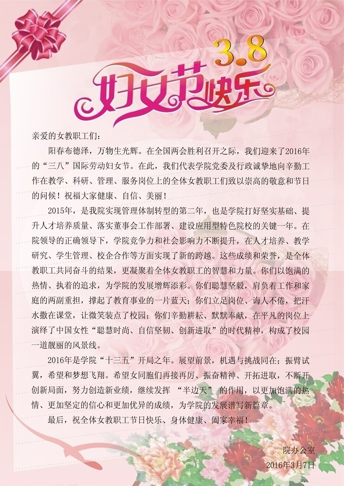 致全体女教职工“三八”国际劳动妇女节的慰问信