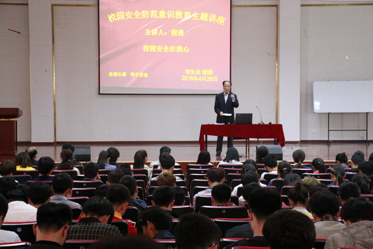 为进一步加强校园安全教育,提高广大师生的安全防范意识,4月28日,我院在图书馆二楼报告厅开展校园安全防范意识教育专题讲座。副院长程勇结合自己长期在高校工作的经验和教训,给师生们上了一堂生动的安全教育课。