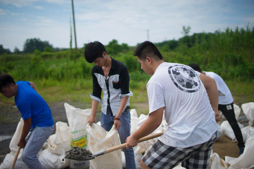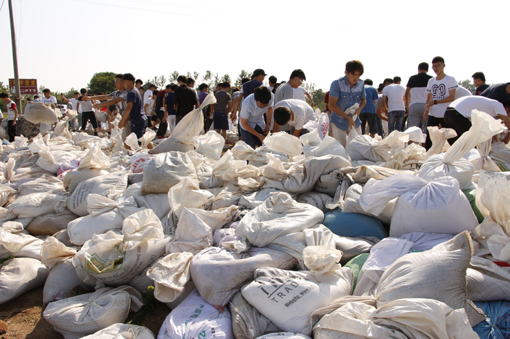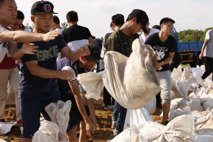 在当地政府工作人员的指导下,现场工作有条不紊。暴雨过后的阳光更加热辣,很快所有人的衣服都被汗水浸湿。他们挥汗如雨,却没有一个人选择退缩。一堆堆的砂石,在志愿者们的铁锹下很快就见底。看着一批批的沙袋被集中运往抗洪前线,同学们的脸上洋溢出笑容。在爆裂的阳光折射下,他们稚嫩的脸庞显的格外坚毅。