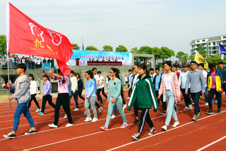 在高亢激昂的进行曲中,运动员们以饱满的精神状态入场。四名国旗班成员举着耀眼夺目的五星红旗、迈着整齐的步伐首先步入会场。随后,校旗及彩旗方队、各系代表方队、志愿者队、裁判员队等依次入场,展示了城建学子青春热情的风采。
