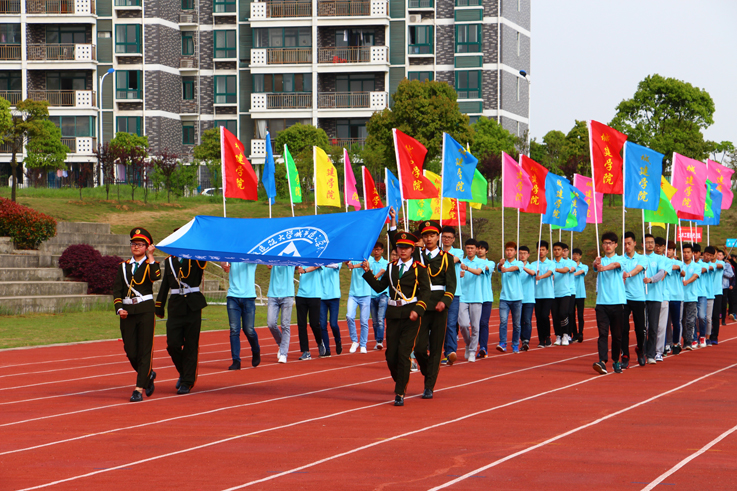 在高亢激昂的进行曲中,运动员们以饱满的精神状态入场。四名国旗班成员举着耀眼夺目的五星红旗、迈着整齐的步伐首先步入会场。随后,校旗及彩旗方队、各系代表方队、志愿者队、裁判员队等依次入场,展示了城建学子青春热情的风采。