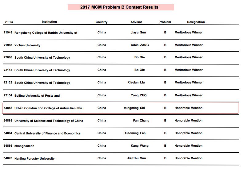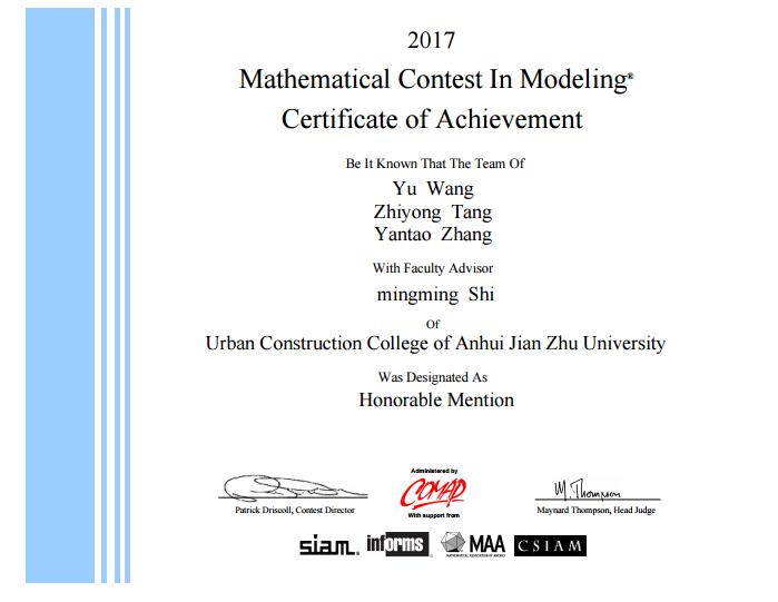 近日,美国大学生数学建模竞赛(MCM/ICM)官方网站揭晓了2017年美国大学生数学建模竞赛结果,安徽建筑大学城市建设学院土木工程系14无机非专业王宇、唐智勇和张延涛三位同学组成的参赛队伍(指导老师:石明明)荣获国际二等奖的好成绩,安徽省内排名仅次于中国科技大学和合肥工业大学。这是我院在该赛事上取得的历史性突破,在国际舞台上充分展现了城建学子的风采。