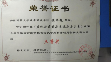 近日,由省科协、省教育厅、团省委主办的安徽省百所高校百万大学生科普创意创新大赛(简称“双百”大赛)在省内各大高校中举行。我院14级建筑与艺术系城乡规划的温华锐同学,在孙自强老师的指导下,获得了三等奖的成绩。