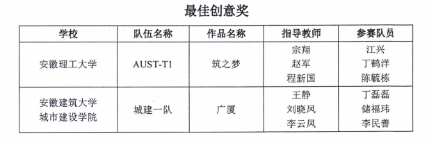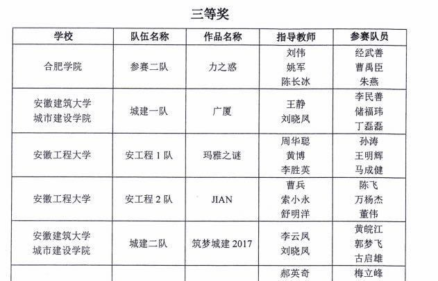 近日,由安徽省教育厅主办、合肥工业大学和合肥学院承办的第十一届全国大学生结构设计竞赛分区赛(安徽)暨第一届安徽省大学生结构设计竞赛结果公布,安徽建筑大学城市建设学院代表队荣获2项三等奖和1项最佳创意奖。