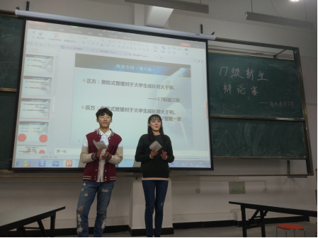 比赛开始,双方辩手相互阐述自己的观点后,相互提问,相互反驳,而自由辩论环节则使辩论赛达到了白热化阶段,辩手们唇枪舌剑,以有理有据的语言来反驳对方观点中的漏洞。精彩的辩论引来同学们一阵阵热烈的掌声。