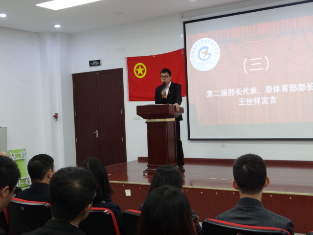 主持人宣布仪式正式开始。首先,第二届主席团代表琚慧上台发言,她由衷感谢第二届全体学生会成员的努力与贡献,也希望新一届的学生会成员能继往开来,做到更上一层楼。接着,第二届学生会部长代表前体育部部长王世祥上台发言,他感谢系老师和同学对学生会工作的支持与付出,欢迎新人的加入,望新一届成员,努力贯彻以服务学生为目标的精神。