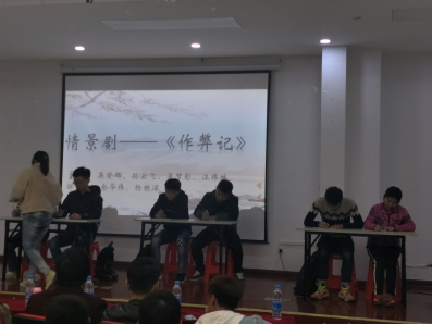 讲堂开始主持人给大家介绍了四维八德,介绍了古人尊信首德的准则。画面一转播放了一段感人之余带走教育的微电影,讲述的是一个贫困患病带着孙女的老人为已逝的儿子还贷的故事,把诚信的可贵突显的淋漓尽致。接着是一出情景剧《作弊记》,是一个学生联合作弊后来悔恨不已的小喜剧。同学们搞怪的表演让观众们捧腹大笑。然后是刺激的击鼓传球游戏,鼓声停止时,球在谁的手中就得回答一个关于诚信的问题。同学们球到手中慌张传递,小礼堂里顿时欢声笑语,热闹无比。紧接着是诗歌朗诵,三名同学声情并茂的朗诵引得阵阵掌声,还有搞笑有趣的相声表演颇受欢迎。压轴的是一首《浮夸》,精彩的演唱、迷人的歌喉把活动推向高潮。活动结束后各班团支书上台签名并合影留念,本次活动完美落幕。