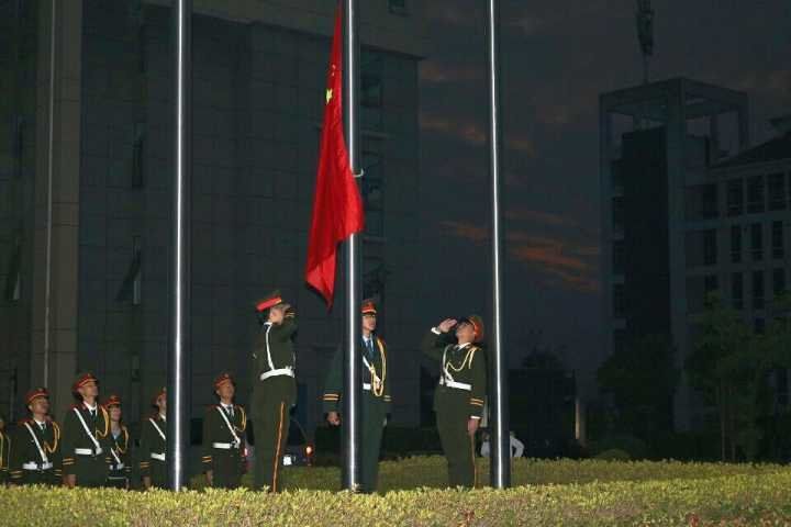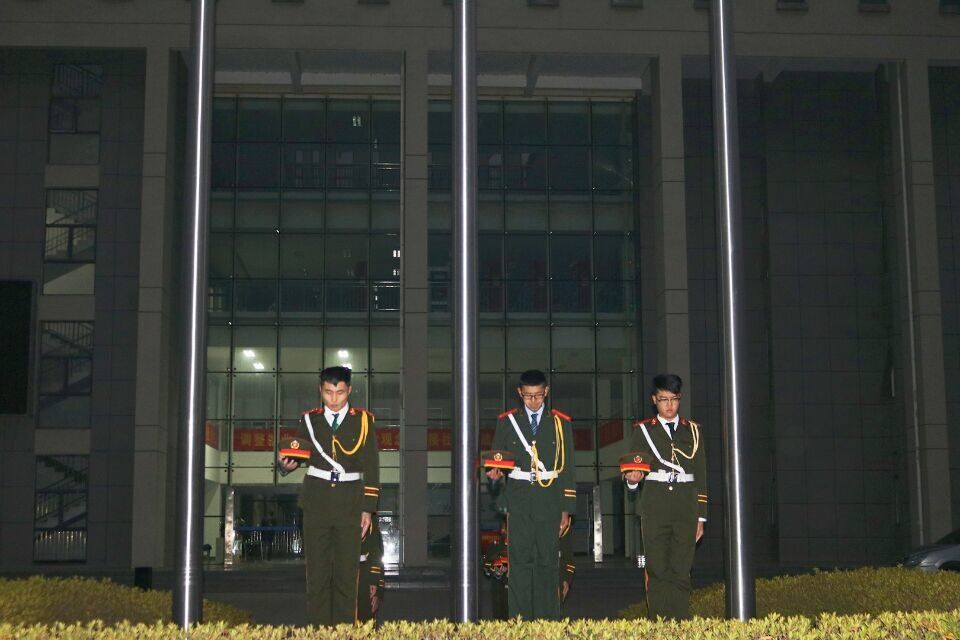 在初冬的晨曦中,国旗杆高高耸立,升旗手精神抖擞地站立在旗杆下。仪仗队迈着矫健的步伐,护卫着中华人民共和国国旗,昂首阔步地走向旗杆。随着中华人民共和国国歌的奏响,五星红旗在众人注视下缓缓升起,为死难者同胞志哀。
