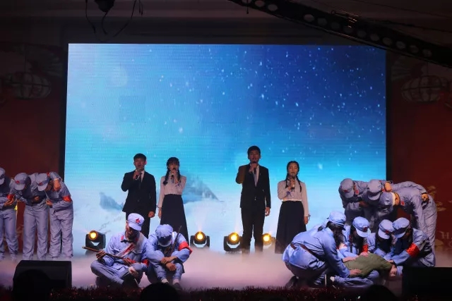 全场晚会的焦点是舞台剧《以梦为马》和朗诵及合唱《中华魂祖国颂》。《以梦为马》,用表演和朗诵的形式展现红军在长征途中克服艰难险阻,追逐梦想的过程。梦想是穿行在万家灯火照亮归途的一盏烛光,同时更像一匹骏马,带领着希望穿过层层阻隔,引领着前进的方向。学院老师参与表演的《中华魂祖国颂》,气势磅礴的朗诵中又蕴含深情,礼赞腾飞进步的祖国。精彩的表演点燃全场观众的激情,把晚会推向了另外一个高潮。