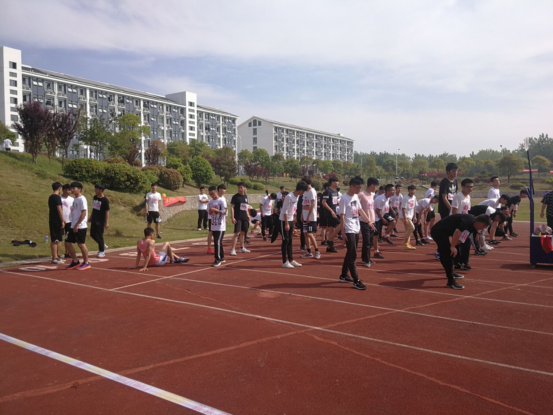 赛场上,随处可见我运动员们矫健的身影。在激烈的比赛前他们自信满满镇定自若,他们活力无限,永不言弃。运动员们在塑胶跑道上开始热身,争取以最好的状态投入到比赛中,为班级,为专业争得荣誉。时间一分一秒的过去,比赛快要开始了,运动员周围的助手和加油的同学纷纷离开比赛场地,来到观众席,一场激动人心的比赛即将开始观众席上的观众也将热情投入到了即将开始的比赛中,一声声加油呐喊,一阵阵擂鼓助威,一遍遍鼓掌摇旗,都是同学们对场上运动员的一种鼓舞。