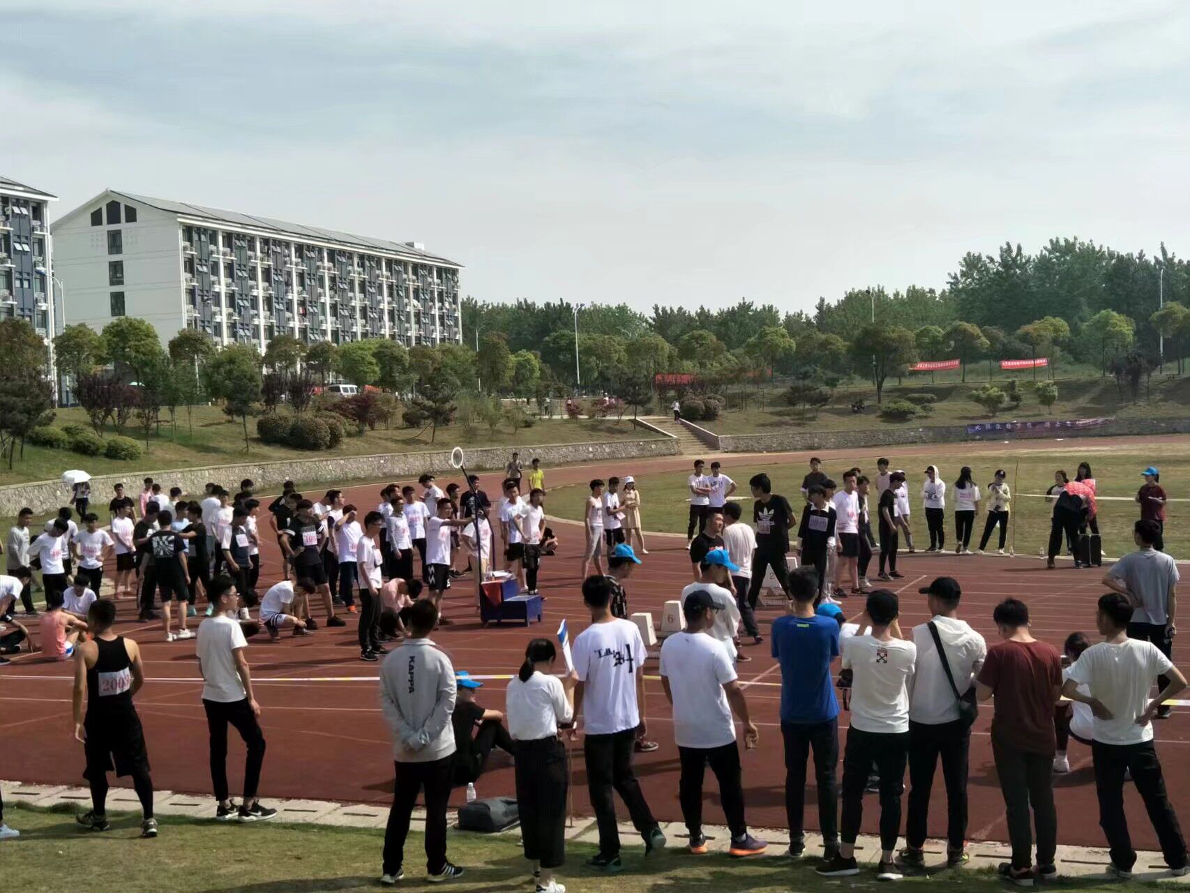 赛场上,随处可见我系运动员们矫健的身影。在激烈的比赛前他们自信满满、镇定自若,他们活力无限,永不言弃。运动员们在塑胶跑道上开始热身,争取以最好的状态投入到比赛中,为班级,为专业争得荣誉。时间一分一秒的过去,比赛快要开始了,运动员周围的助手和加油的同学纷纷离开比赛场地,来到观众席,一场激动人心的比赛即将开始,观众席上的观众也将热情投入到了即将开始的比赛中,一声声加油呐喊,一阵阵擂鼓助威,一遍遍鼓掌摇旗,都是同学们对场上运动员的一种鼓舞。