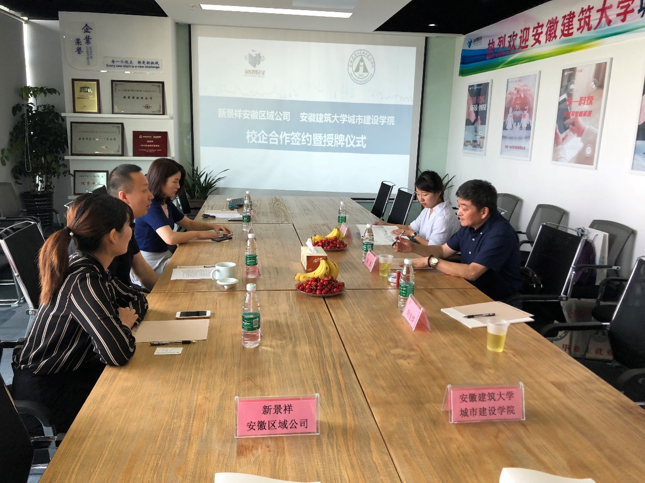 接着双方就当前的就业形势、毕业生就业心态、校企合作模式等问题展开详细洽谈。座谈会最后,副院长田园与新景祥安徽区域总经理吕锡斾进行了《安徽建筑大学城市建设学院毕业生就业基地建设协议》签约仪式,并共同为“安徽建筑大学城市建设学院毕业生就业基地”揭牌,并互授挂牌。