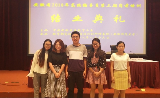 为深入学习贯彻落实新时代中国特色社会主义思想和党的十九大精神,进一步把全国高校思想政治工作会议精神贯彻落实引向深入,推动高校思想政治工作专门力量建设,切实培养一支高质量、高水准的高校思政工作骨干队伍。在我校领导高度重视下,以学生处牵头,选派五位专职辅导员赴教育部高校辅导员培训和研修基地(安徽师范大学)参加2018年高校辅导员第三期岗前培训。