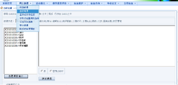 1.进入教务管理系统网站,以学生身份登录系统。鼠标点击“网上选课”后,出现下拉菜单,再点击“选体育课”。