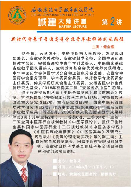 8月31日下午,教师教学能力第三期培训暨城建大师讲堂第二讲在图书馆二楼报告厅开讲,本次讲座邀请安徽中医药大学教授、发展规划处处长储全根教授,以“用新认识新理念新方法促进学生成长和教师发展”为主题,为我院教师作了精彩报告。讲座由副院长吴约主持,全院一百三十余名教师参加本次培训,院长张伟林全程参加了报告会。