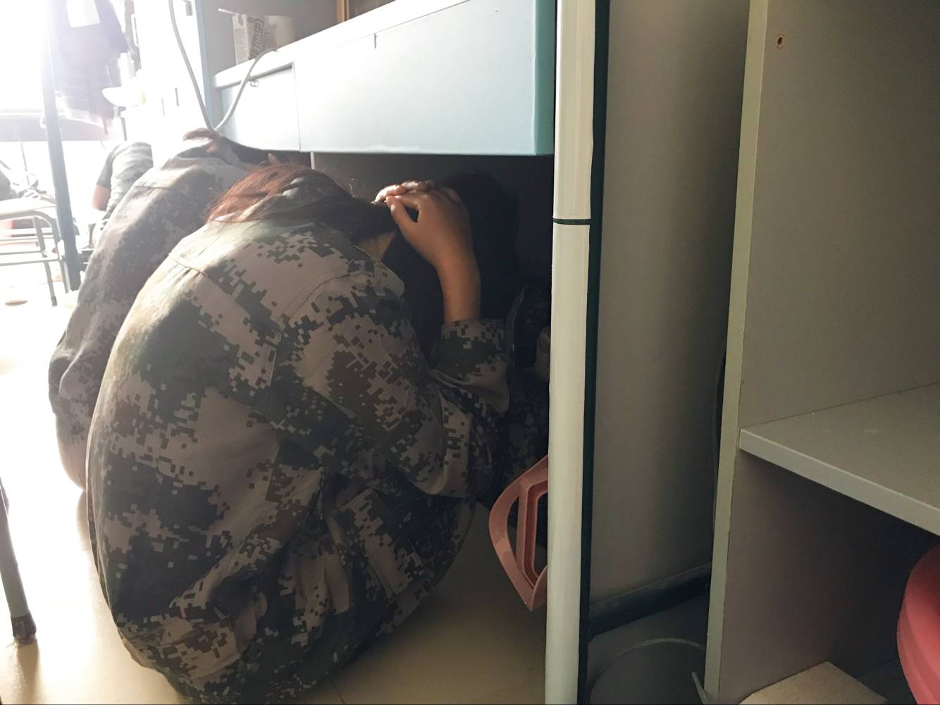 13点50分一声紧急的哨声划破1、3、7号新生宿舍楼的安静,听到哨声的18级学生随即在宿舍双手护着头部蹲在桌下一分钟,动作干净利索。他们说如果是真正危机的时候,这一分钟得多漫长。