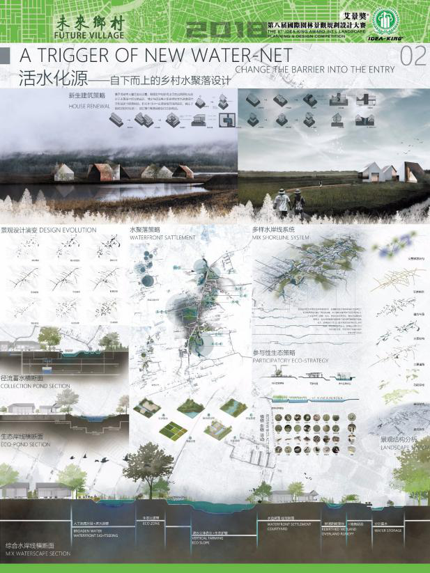 大赛以“未来乡村”为主题,旨在响应中央一号文件《中共中央国务院关于实施乡村振兴战略的意见》的号召,助力乡村振兴建设领域的发展。学院风景园林专业梁雷、王宇、康婧妍、黄可宸的参赛作品《活水化源——自下而上的乡村水聚落设计》基于当前乡村发展困境,设计者们选址安徽省合肥市烟墩镇选址卫王村作为本次未来乡村规划的区域。村落拥有沿着主枝干发散的原有肌理,而在产业生态缺失,人口流散等种种现状下,多处可见衰退。在思考中,场地被挖掘出了最致命的痛点——水的滞留,村落本身拥有的优秀合理的布局规划却并未得到应有的发展结果,反而使得原有的模式日渐衰弱,趋于消亡,核心的原因正是这一关键枢纽未能开启。因此,转痛点为切入点的水聚落再设计成为核心的理念。沿着场地本身的诉求,推测出正相关的路线,重新构建水网络,引发综合水岸线串联成的水聚落,解决生态,生活,生产和游憩体验等多种空间的生长融合,以自下而上的思维打开切入点,激活整个未来乡村的新系统。同时,基于所选村落为基地周围村落中典型的代表,因此这样的规划方式,具备成为周边其他乡村复兴的模式的潜力。作者们认为未来乡村,应源自于现在的乡村,避开于对城市的模仿,探寻到原有发展的核心内涵。未来乡村值得拥有创造性的量身定制。