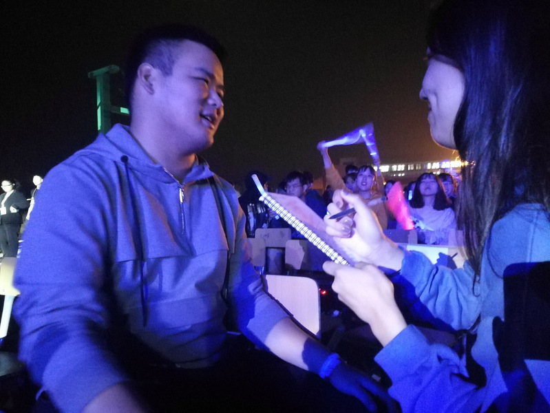 台下的观众也是全程捧场,其中有一位更是一直打call、合唱一刻不停,他是城乡规划的新生缪文清。他非常满意这次的迎新晚会,他说:“本以为迎新晚会会在室内举行,没想到在室外。每个人还有荧光棒,没有想象中的那么沉闷,很有新意。”缪文清最喜欢的节目就是Rap《离开》,原因是他自己也是一位说唱爱好者,这首Rap点燃了他的说唱之魂。“节目的选择真的很有质量,刚刚那首Rap真的唱得很好。”他毫不吝啬的表达了自己的喜爱和赞美之情。比起其他新生千篇一律的大学未来目标,他的目标有些特别。他希望成为一个说唱歌手,可以发表自己的原创曲目。