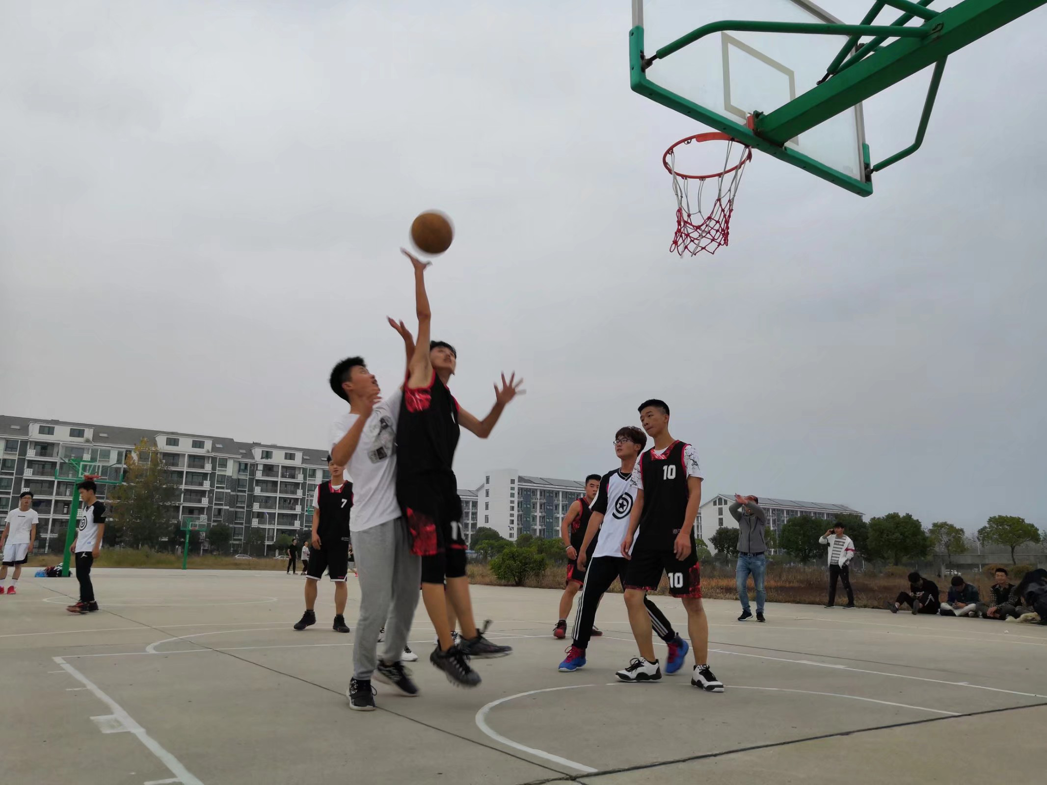 场上两队比分十分接近,队员们紧绷着神经,盯着那小小的篮球,使尽浑身解数将它抢到手里、投进对手的篮筐里,场下的观众们在各班体委的组织下整齐划一的为本专业的队员们加油,他们如火的热情感染了场上的队员们,两队的队员们皆是一身短打,却在场上挥汗如雨,打得热火朝天。