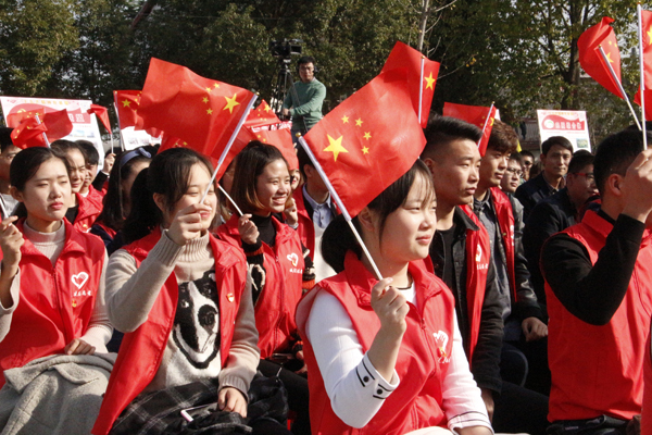 城建学院40名大学生党员志愿者身着红色志愿者马甲,胸前佩戴党徽,手持鲜艳的五星红旗,在温暖的阳光下显得格外活泼有朝气,他们组成的大学生志愿者方队与机关干部代表队、村居群众代表队、企业职工代表队交相呼应,访谈现场气氛热烈。