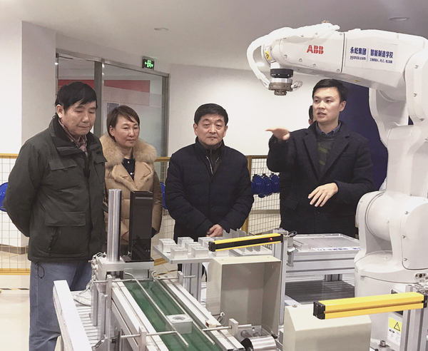 期间,在合肥永屹智能制造学院董事长袁丽、院长唐杰的陪同下,学院副院长田园一行先后参观了由工业机器人四大家族为主体组成的无人化自动产线及整个生产线的全部流程作业、工业机器人实训大厅、远程教学室等现代化设备。