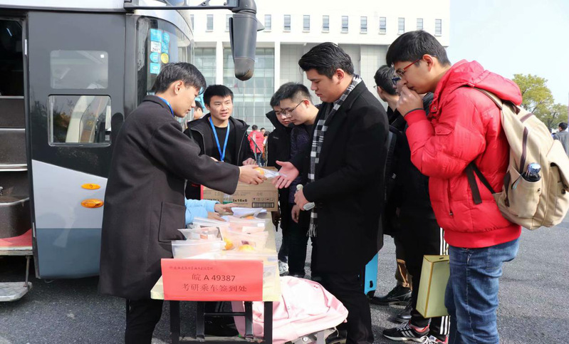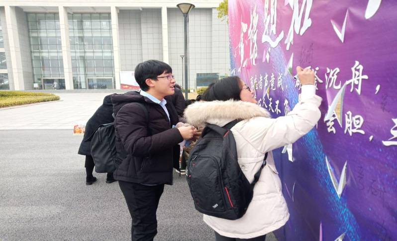 在谈到今年考研的感受时,同学们认为免费供热水、免费送考的暖心服务让他们感受到了家一般的温馨,虽然考试很紧张,但当走出宿舍,看到“考研送考车”在等候,心里就有说不出的温暖和感动,也在“金榜题名 蟾宫折桂”的喷绘上写下了心中的豪言壮志。