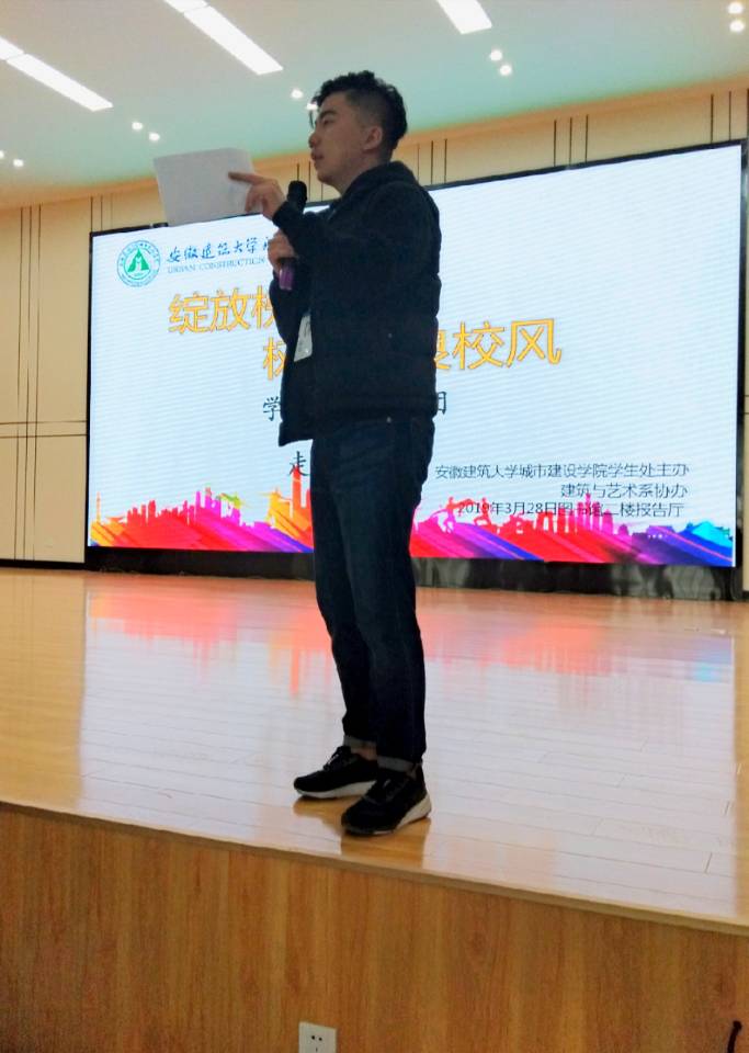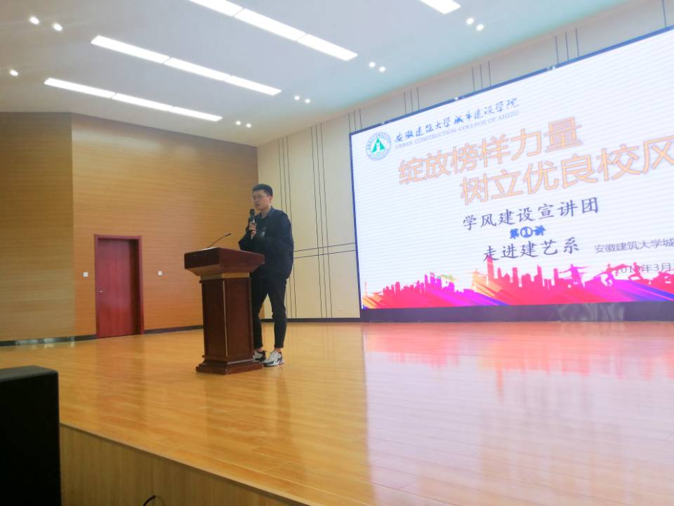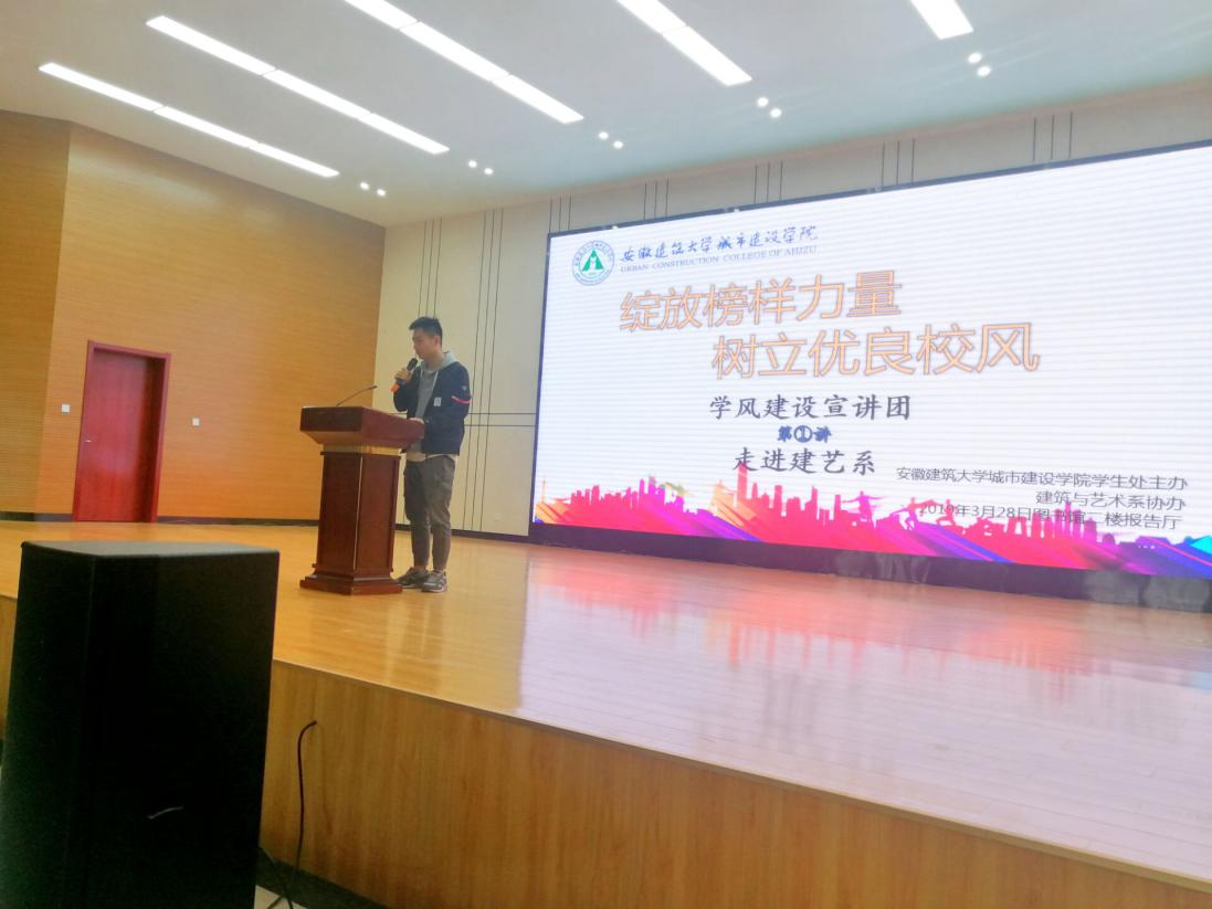 今天下午两点建筑与艺术系于图书馆大礼堂正式举行了学风宣讲会。高宇老师向17、18级到场的同学们介绍了15、16级优秀的学长们。到场演讲的有张景辉、朱涵宇、王敬文,他们分别通过自己平常的考研经历、学习经历,向大家发表了感言。