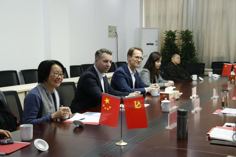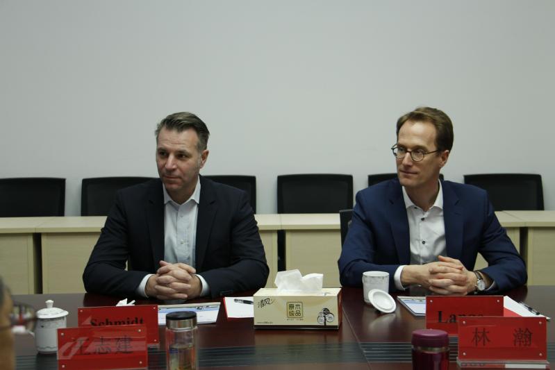 副院长田园致欢迎词,董事长林瀚介绍学院办学历史,德方代表介绍了应用型本科教育办学历史,双方借鉴合肥学院与大陆公司合作建立“大陆班”的办学经验,双方展开讨论交流。