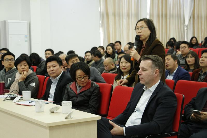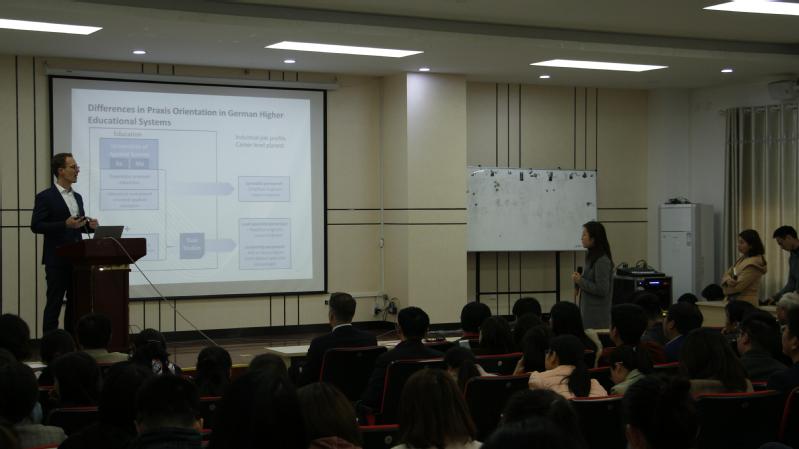 随后,Lange教授与Schmidt教授面向全院教职工进行讲座,讲座的主要内容是“双元制教育及应用科技大学教育讲座”,Lange教授与Schmidt教授就“双元制”培养模式中人才培养的课程设置,企业实训,企业文化适应等诸多方面做了深度介绍,并对“双元制”教育模式的前景展开积极展望。提问环节中学院多名教师对于“双元制教育”对教师的要求、对学生管理保障、对课程专业要求、对实验实训效果等进行提问。Lange教授与Schmidt教授都一一作了详细解答。