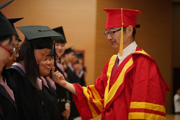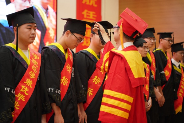 院长张伟林为毕业生扶正流苏。全体毕业生身着学院定制赠送学士服,头戴学士帽,依次走上台。张伟林为每一位毕业生扶正流苏,将老教育工作者的希冀与祝福传递给未来的祖国栋梁。毕业生们与与会领导或握手,或拥抱,在感谢学院的培养与关爱的同时,也将这庄严而肃穆的时刻铭记于心,永远定格。