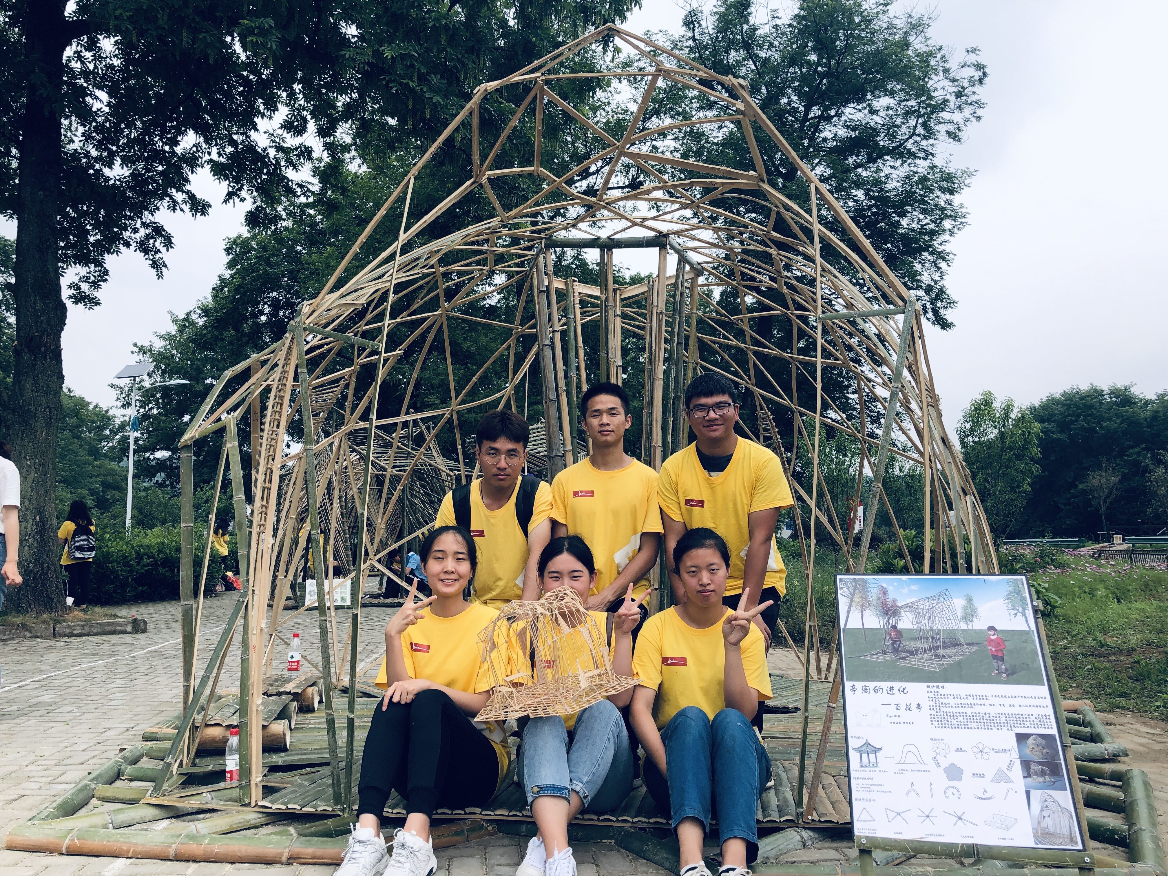 本次竞赛充满了新奇和挑战,同学们走出校门、采用真实材料,利用原竹、竹片主材,辅以铁丝、麻绳、螺栓等进行实地搭建的过程中与省内外高校师生进行相互交流,相互学习,教学与实践环节相融合。使同学们对本专业有了更为清晰的认识,也为我校教学质量打下了坚实的基础。