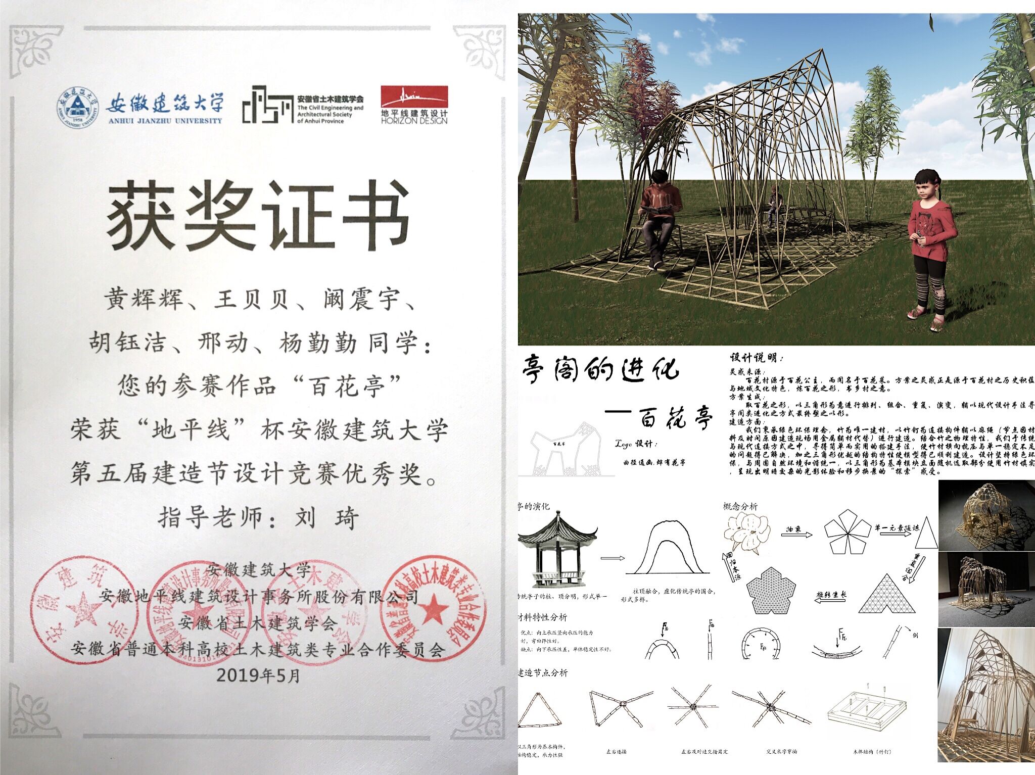 “地平线”杯安徽建筑大学第五届建造节颁奖典礼日前完成,安徽建筑大学城市建设学院建筑与艺术系教师刘琦带领17级建筑学学生黄辉辉,王贝贝,阚震宇,胡钰洁,邢动,杨勤勤,在本届建造节中的作品《百花亭》脱颖而出,并在庐江县汤池镇百花村进行为期三天的1:1实体搭建环节,最终获得优秀奖。