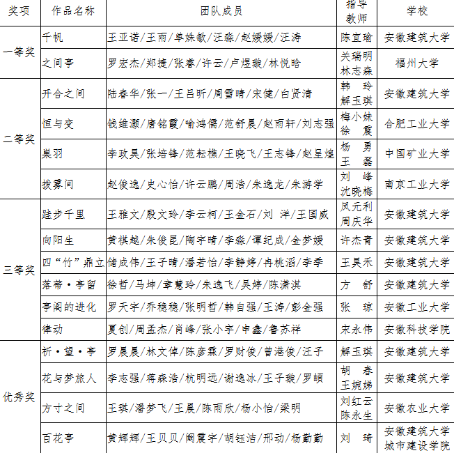本届建造节以“亭阁的进化”为主标题,以“竹”为主要材料,辅以铁丝、麻绳进行建造。共有来自中国矿业大学、南京工业大学、福州大学、合肥工业大学以及安徽省普通本科高校土木建筑类专业合作委员会11所成员高校纷纷组队参赛,收到校内作品42组、校外作品34组共76组参赛作品,采取“网评”方式进行,评审组由东南大学等高校专家组成。经评审,最终9所高校16组参赛作品晋级决赛。