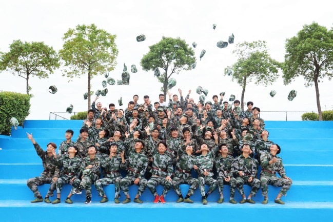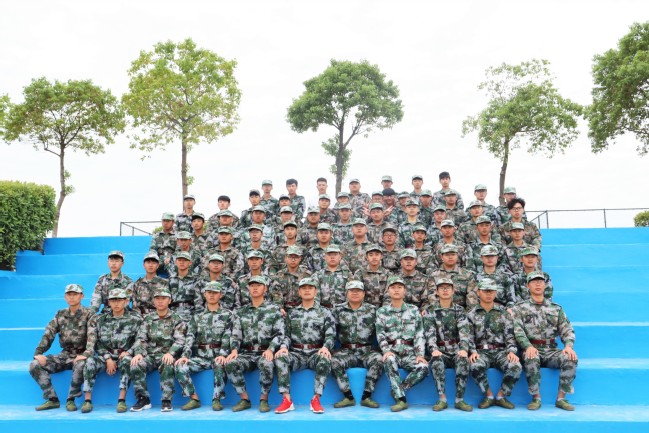 这时一个男生突然找上记者,希望我们能用相机给他连拍张照。男生来自19级环境设计专业名叫赵迎新,是十连的军训联络员。在赵迎新的招呼下,十连的同学陆陆续续坐上阶梯准备拍照。有的两两勾肩搭背,有的笑着互相交谈,有的在互相调侃,一时间其乐融融,好不热闹。他们的友谊,就在军训短短的十几天中建立起来了。“坐直!拍照!”一声令下,大家都安静了下来一个个坐得笔直,面色严肃,可还有几个调皮的偷笑着悄悄在后面比出了剪刀手。