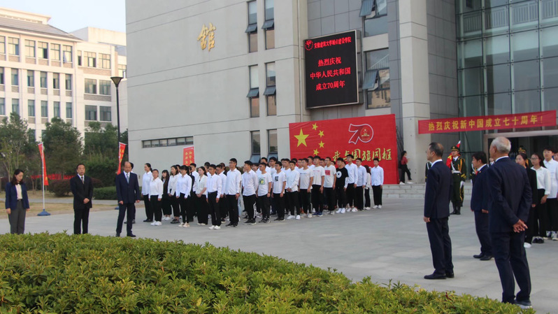 值此举国上下欢庆新中国成立70周年之际,安徽建筑大学城市建设学院用这种简约而庄重的方式致敬国旗、祝福祖国,表达了全院师生团结一致、拼搏奋进的决心和信心。新中国成立70年来,我们党始终不忘初心、牢记使命团结带领人民艰苦奋斗,中华民族迎来了从站起来、富起来到强起来的伟大飞跃。回顾过去,展望未来,我们没有任何理由不加倍努力,没有任何理由不只争朝夕,没有任何理由不勇往直前。