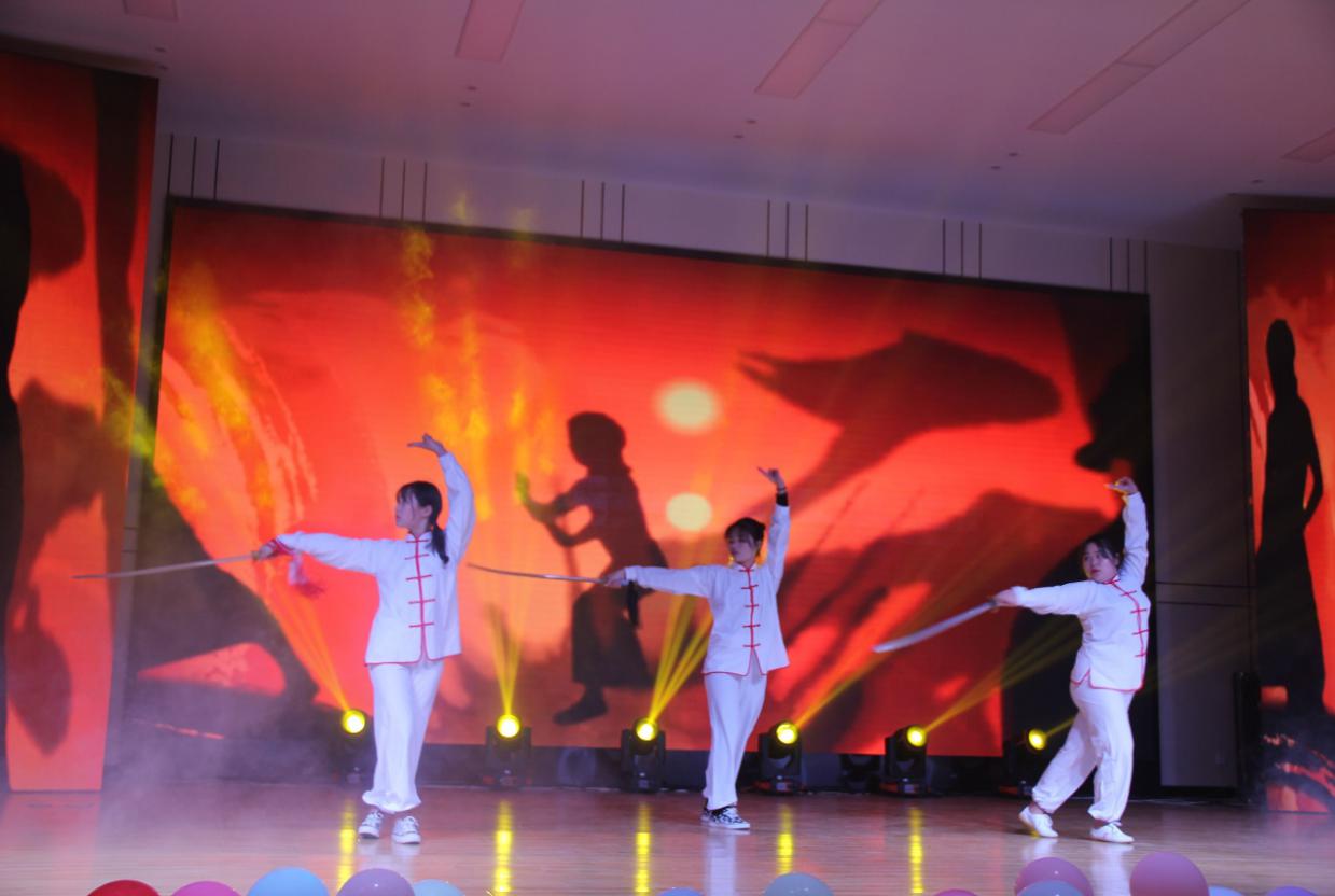 劲爆的音乐秀将全场的目光集聚在舞台中央,动感的音乐点燃全场的气氛,如此晚会就以别开生面的方式拉开它神秘的面纱。动感并未就此结束,一群青春满满的小哥哥小姐姐们扭动着妖娆的舞姿,在酷炫的音乐配合中感染着场下的观众,全场欢呼不止。“我还要遇见几个你,才可以忘记你,我还要拒绝几个你,才可以不想起”想要忘记一个人却不断想起,如此反复。而19道桥蔡瑞同学将此番情绪淋漓尽致表达在歌曲里。音乐结束,他依然陷入其中。一声声呐喊震荡全场,他们按剑在手,收敛笑容,刷地亮开架势,就这样我们迎来了武术协会带来的视觉盛宴——中华武术。这段表演深深体现了中华民族文化的影响之远,意义之大。