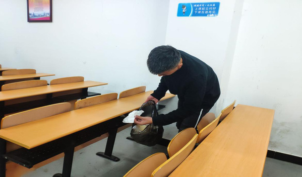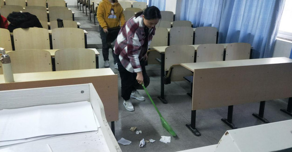 2019年11月13日下午,机电系学生党支部展开了“教室保清洁,党员我先行”的主题活动,保持教室卫生十分重要,不仅有利于同学们的身体健康,而且有利于同学们养成良好的卫生习惯,并能让同学们生活在整洁的教室环境中认真搞好学习。下午三节课之后,全体党员分成两组,分别拿着垃圾袋对东教学楼和南教学楼进行卫生打扫。首先同学们对教室抽屉里的垃圾进行清理。抽屉里的垃圾大多都是上课的同学留下的饮料瓶和卫生纸。