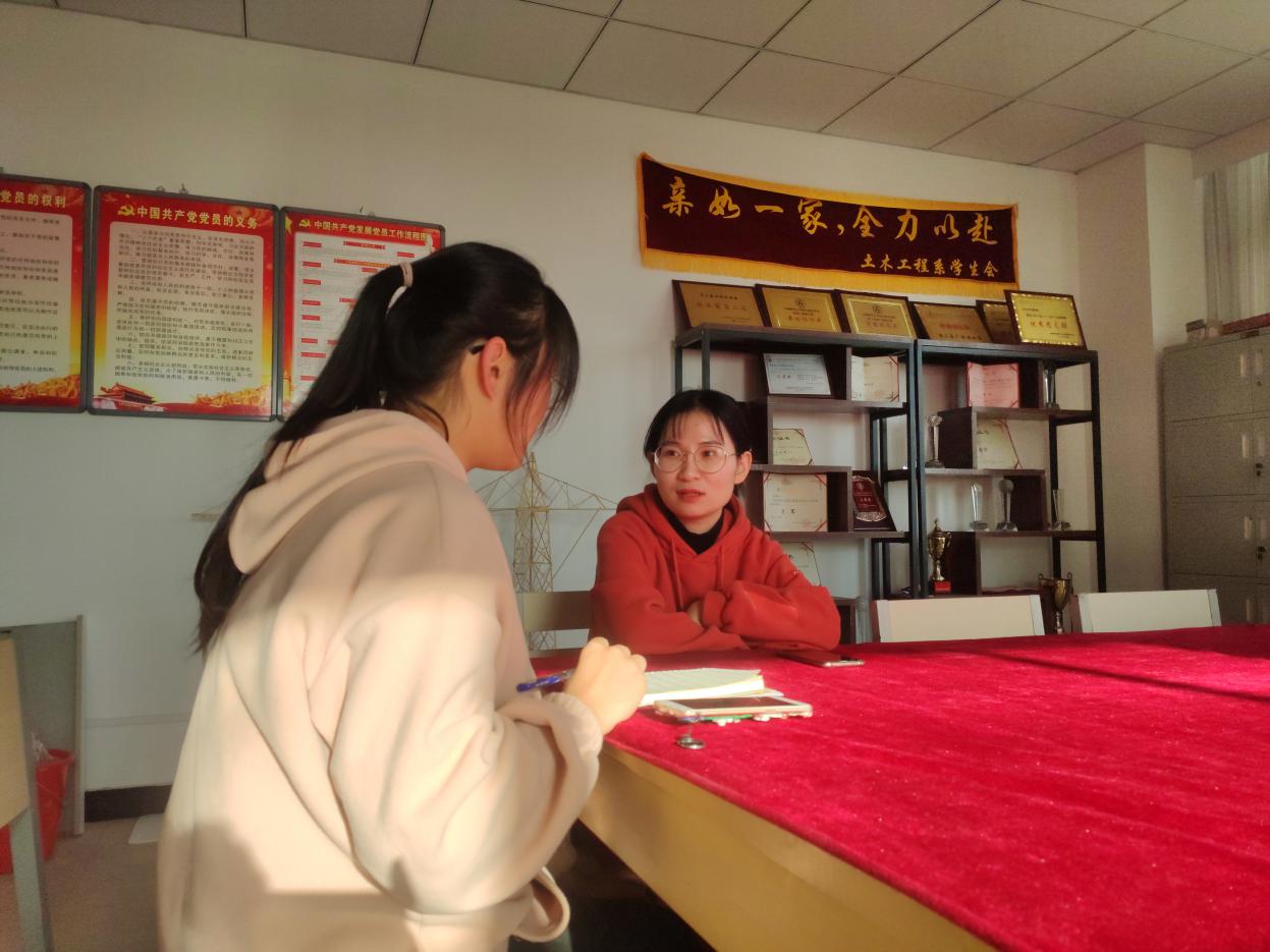 19级新生对大学生活也有所适应,但仍有少许的疑惑。今天,土木工程系宣传部有幸请来了19级给排水专业辅导员吴雅婷老师。在与吴雅婷老师刚见面时,老师就表示十分的开心,同样在老师的心情感染之下,缓解了学生会同学的紧张。