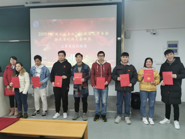 2019年12月24日中午12点,安徽建筑大学城市建设学院管理个工程系在南教学楼208教室成功举办2019年第四届“国元证券杯”安徽省大学生金融投资创新大赛校内总结颁奖会。