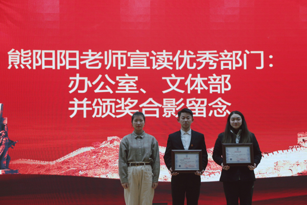 后学生会主席周世耀学长宣读优秀干部、优秀干事及最佳奉献奖名单并为最佳奉献奖获得者颁奖,19级辅导员马其霞老师为优秀干部颁奖且合影留念,各分管主席为分管部门的优秀干事获得者颁奖及依次合影留念。周世耀主席上台发言后,由19级辅导员熊阳阳老师宣读优秀部门名单并颁奖。