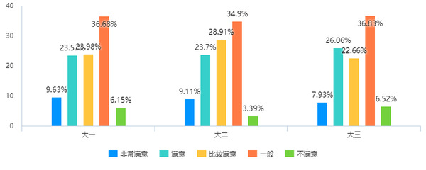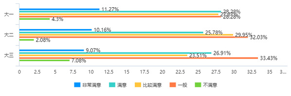 将不同年级学生与网络学习安排满意度进行交叉分析发现,学生对网课整体满意度较高,其中低年级满意度较高,高年级满意度低于低年级在同年级中所占比例。