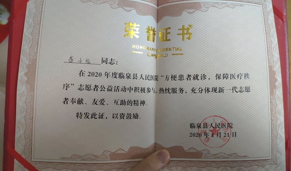 即便后期疫情事态严重,李小龙同学也没有放弃志愿工作。他表示:“作为一名入党积极分子应该时刻向正式党员看起,作为中华民族的先锋队,我有责任有义务在国家危难之时站在人民的前方”。直至24日疫情事态严重,医院成为疫情发生感染的高危区。医院强制性要求志愿者居家防疫,李小龙同学才结束志愿,并居家隔离。