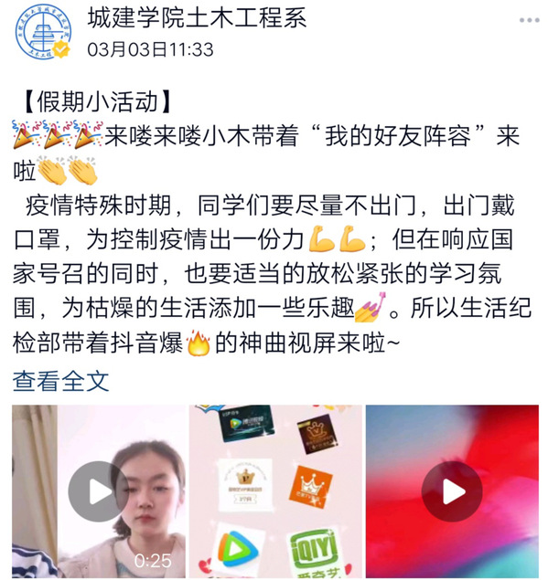 自新型冠状病毒肺炎发生以来,开学被迫延迟,紧张的线上学习之后,安徽建筑大学城市建设学院土木工程系学生会生活纪检部为增强师生疫情期间课余生活的趣味性,于2020年3月3日至3月7日开展网上录制“我的好友阵容”的抖音视频活动。