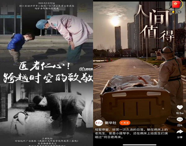 线上主题班会气氛十分活跃,紧接着许桐老师带领同学们进入班会的第二环节,请同学们回忆在新闻上看到的关于此次疫情间发生的令自己印象深刻的画面或事件,通过彼此分享,有不少同学之间产生情感共鸣。