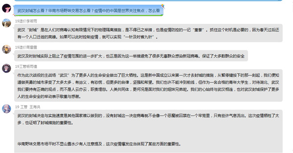 本次主题班会有三个环节,分别是回顾思政大课内容、分享印象深刻案例和表扬疫情期间志愿者。第一环节辅导员首先带领大家一起回顾了四位教授的讲授内容:艾四林教授立足中国抗击疫情的具体实践,引导学生深化对马克思主义基本理论的认识、深化对马克思主义中国化最新成果的认识;秦宣教授聚焦于“疫情大考告诉我们什么?”这一问题分析中国抗疫彰显出的中国共产党领导和中国特色社会主义制度的显著优势;王炳林教授则从我国历史上的防疫斗争历程出发,分享从磨难中奋起、化危机为转机的历史经验和智慧;最后,冯秀军教授以战“疫”里的青年责任与担当为主题,深情讲述这场疫情中勇敢逆行的年轻风景,引导大学生群体担当历史使命。大部分同学都认真观看了课程并做了详细的记录。随后,许桐老师根据四位教授的不同演讲主题分别提出了四个问题,同学们在群里各抒己见,积极的发表观点。