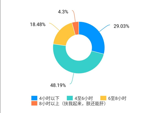 网课已经开课将近一个月了,建艺系的学习依然是干劲满满。29.03%的学生每天学习4小时以下,48.19%的学生每天学习4-6小时,18.48%的学生每天学习6-8小时,4.3%的学生每天学习8小时以上。