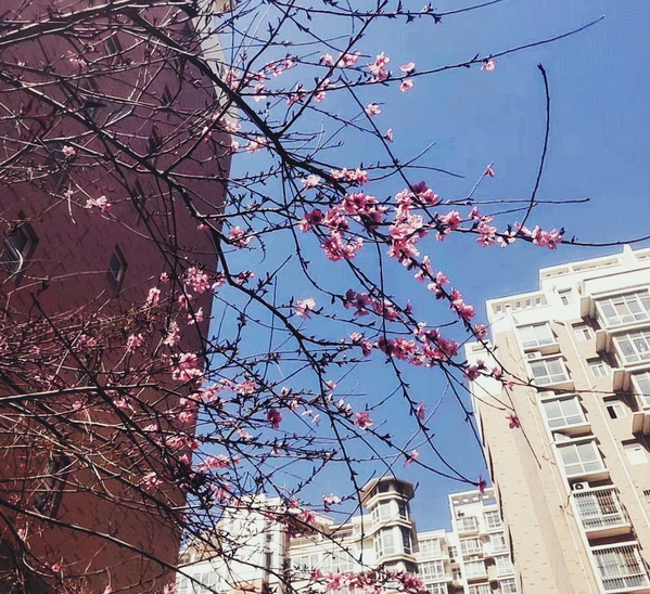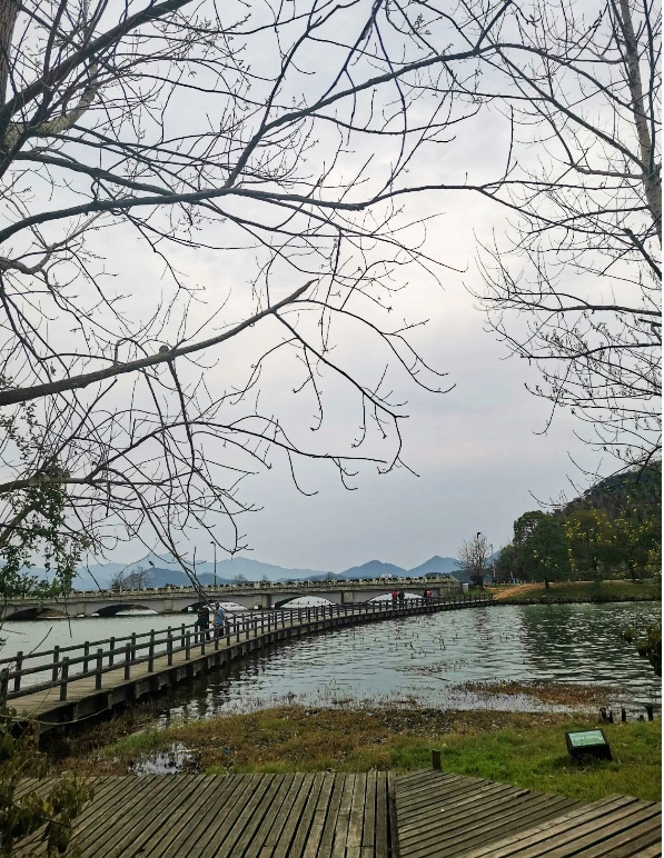长桥上,人们三三两两的走动着,桥下的湖水,在微风的吹拂下泛起点点涟漪。桥的前面,落尽树叶的树干挺立着,虽是三月阳春,却带有一丝凉意。而在桥的后面,桃花都已开放,粉里透红,一朵紧挨一朵,挤满了整个枝条。