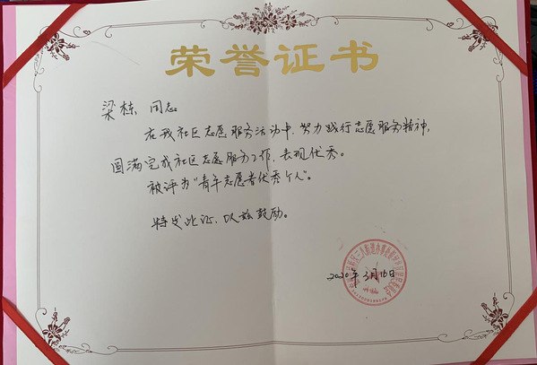 在志愿者服务工作结束后,梁栋同学所在街道办事处高度赞扬梁栋同学的工作,并授予了梁栋“青年志愿者优秀个人”的称号。